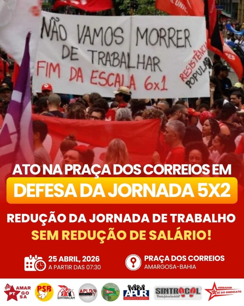 A Associação dos Professores Universitários do Recôncavo (APUR) também estará presente no ato em Defesa da Jornada 5×2, que ocorrerá na Praça dos Correios, em Amargosa, neste sábado, 25. O evento é apoiado por entidades sindicais e partidos políticos que são favoráveis a redução de escala de trabalho sem cortes salariais. O horário de saída do ato é a partir das 7h30. A APUR vem somando forças às ações a favor da redução da escala 6×1 e convida a todos para que também participem ativamente das manifestações. Salientamos que este é o momento essencial para pressionarmos o Congresso Nacional, que é de maioria conservadora e neoliberal, para atender às expectativas da classe trabalhadora brasileira. Além deste ato em Amargosa, a APUR também marcará presença na Audiência Pública sobre o fim da jornada 6×1, que ocorrerá às 19h, desta quarta-feira, 22, na Câmara de Vereadores de Cruz das Almas. Junte-se a nós!