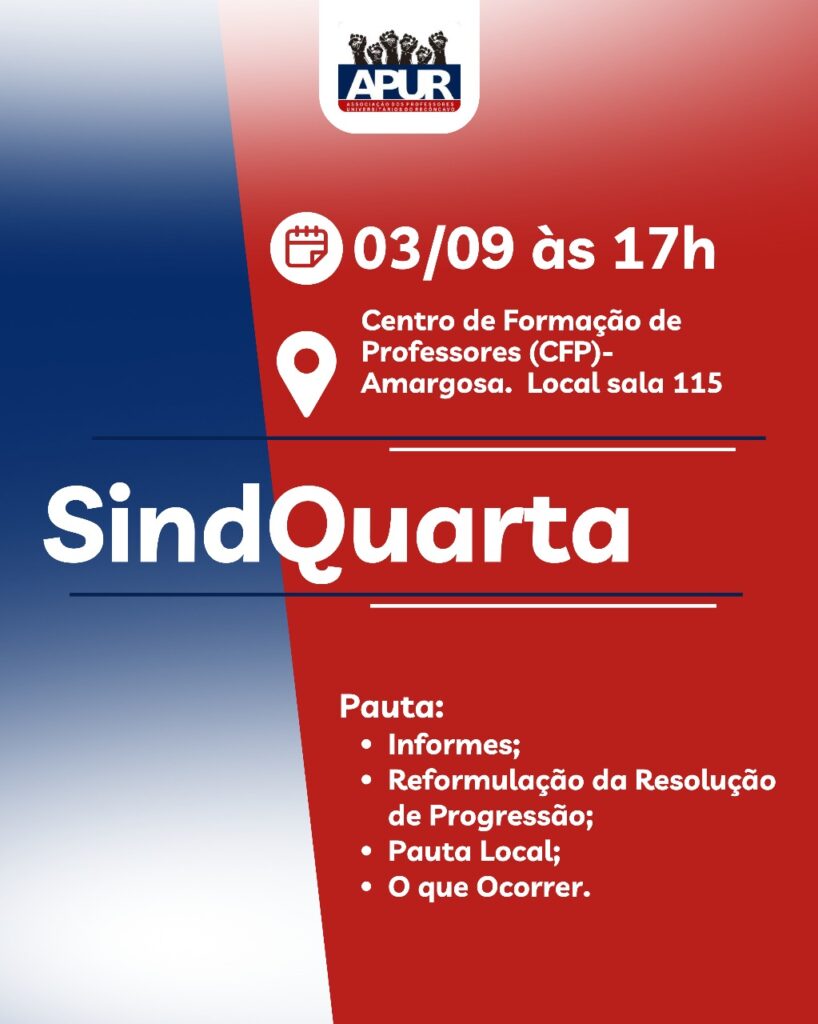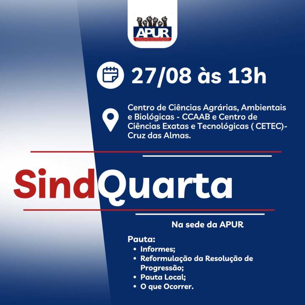 A Diretoria da Associação dos Professores Universitários do Recôncavo (APUR) estará presente no Centro de Formação de Professores (CFP), em Amargosa, e realizará uma reunião com os/as docentes, na próxima quarta-feira, 3, na sala 115, às 17h. O evento faz parte do projeto SindQuarta, que tem o objetivo de atualizar a pauta de reivindicações dos/das professores/as, ouvindo demandas nos locais de trabalho. A pauta a ser discutida abordará a reformulação da resolução e progressão, bem como questões laborais do dia a dia. O SindQuarta visitará todos os Centros de Ensino da UFRB nos próximos dias. Na última semana, o CCS, em Santo Antônio de Jesus, foi o primeiro campus a receber o encontro. Já nesta semana, os campi CCAAB/CETEC tiveram a reunião.
