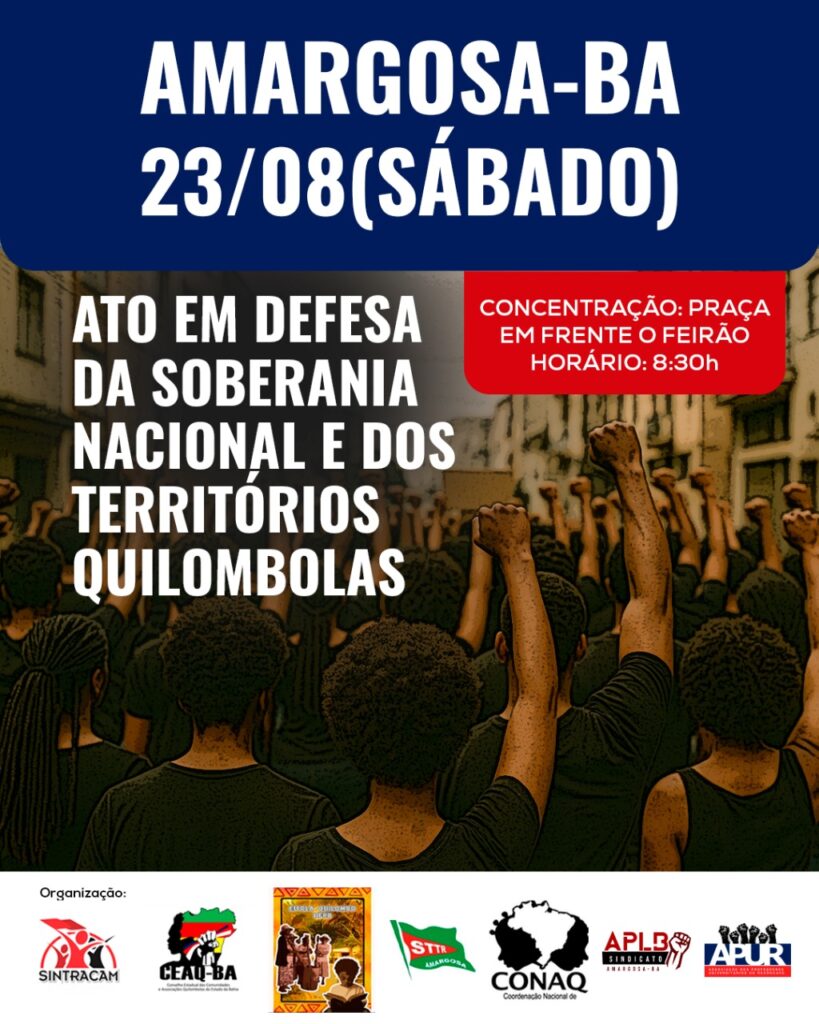 A Associação dos Professores Universitários do Recôncavo (APUR) participará do ato em defesa da soberania nacional e dos territórios quilombolas convocado para o próximo dia 23, em Amargosa. A concentração do evento ocorrerá na praça em frente ao feirão municipal, às 8h30. Além da APUR, as entidades STTR – Amargosa, Escola Quilombo UFRB, CONAQ, CEAQ-BA, APLB e SINTRACAM são as organizadoras do ato. Convidamos você para participar deste movimento também. A mobilização coletiva forma posicionamentos contundentes e pressiona nossos líderes políticos para que escutem a base.Quem tem sindicato nunca está só!