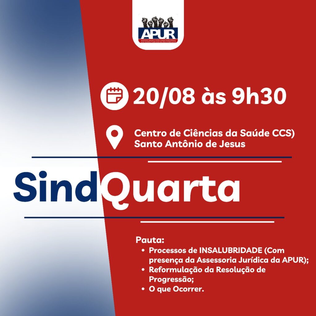 A Diretoria da Associação dos Professores Universitários do Recôncavo (APUR) realizará o Sindquarta, programa de reuniões sindicais que visita todos os campi da Universidade Federal do Recôncavo da Bahia (UFRB), a partir da próxima quarta-feira, 20. O intuito é atualizar a pauta docente local, ouvindo de perto a base. O primeiro Centro a ser visitado será o CCS, em Santo Antônio de Jesus. Além da diretoria, a Assessoria Jurídica sindical também estará presente no CCS. A reunião sindical do CCS (Santo Antônio de Jesus) ocorrerá às 9h30 da próxima quarta-feira, 20. As pautas que serão discutidas são: os processos de insalubridade (com presença da Assessoria Jurídica da APUR); reformulação da Resolução de Progressão e o que ocorrer. É imprescindível a participação dos/das docentes do CCS neste encontro, pois, dessa forma, poderemos atualizar nossa pauta local adequadamente e empreender novas lutas. Próximas reuniões Os próximos encontros do Sindquarta ocorrerão no CCAAB/CETEC, em Cruz das Almas, no dia 27 de agosto, às 13h; no CAHL (Cachoeira/São Félix), no dia 3 de setembro, às 15h; no CFP (Amargosa), também no dia 3 de setembro, às 17h; no CETENS (Feira de Santana), no dia 10 de setembro em horário a ser definido; e no CECULT (Santo Amaro), também no dia 10 de setembro em horário a ser definido. Participe!