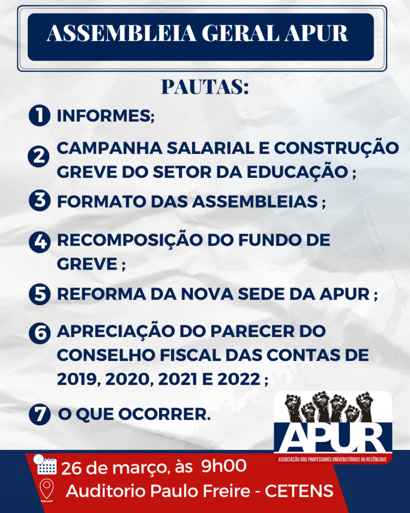 A Associação de Professores Universitários do Recôncavo (APUR) convoca seus filiados a participarem da Assembleia Geral, que ocorrerá no Centro Ciências e Tecnologia em Energia e Sustentabilidade (CETENS), em Feira de Santana. O encontro ocorrerá no próximo dia 26 de março, às 9h, no Auditório Paulo Freire. Discutiremos a Campanha Salarial e a construção da greve do setor de educação; o formato das assembleias; a recomposição do fundo de greve; a reforma da nova sede da APUR; a apreciação do parecer do Conselho Fiscal das contas de 2019, 2020, 2021, 2022 e o que ocorrer. É necessário que todos participem da Assembleia Geral para construirmos os melhores encaminhamentos para avançarmos na luta pelo nosso reajuste salarial e demais reivindicações, bem como lutarmos pelos nossos direitos. Quem tem sindicato, nunca está só!