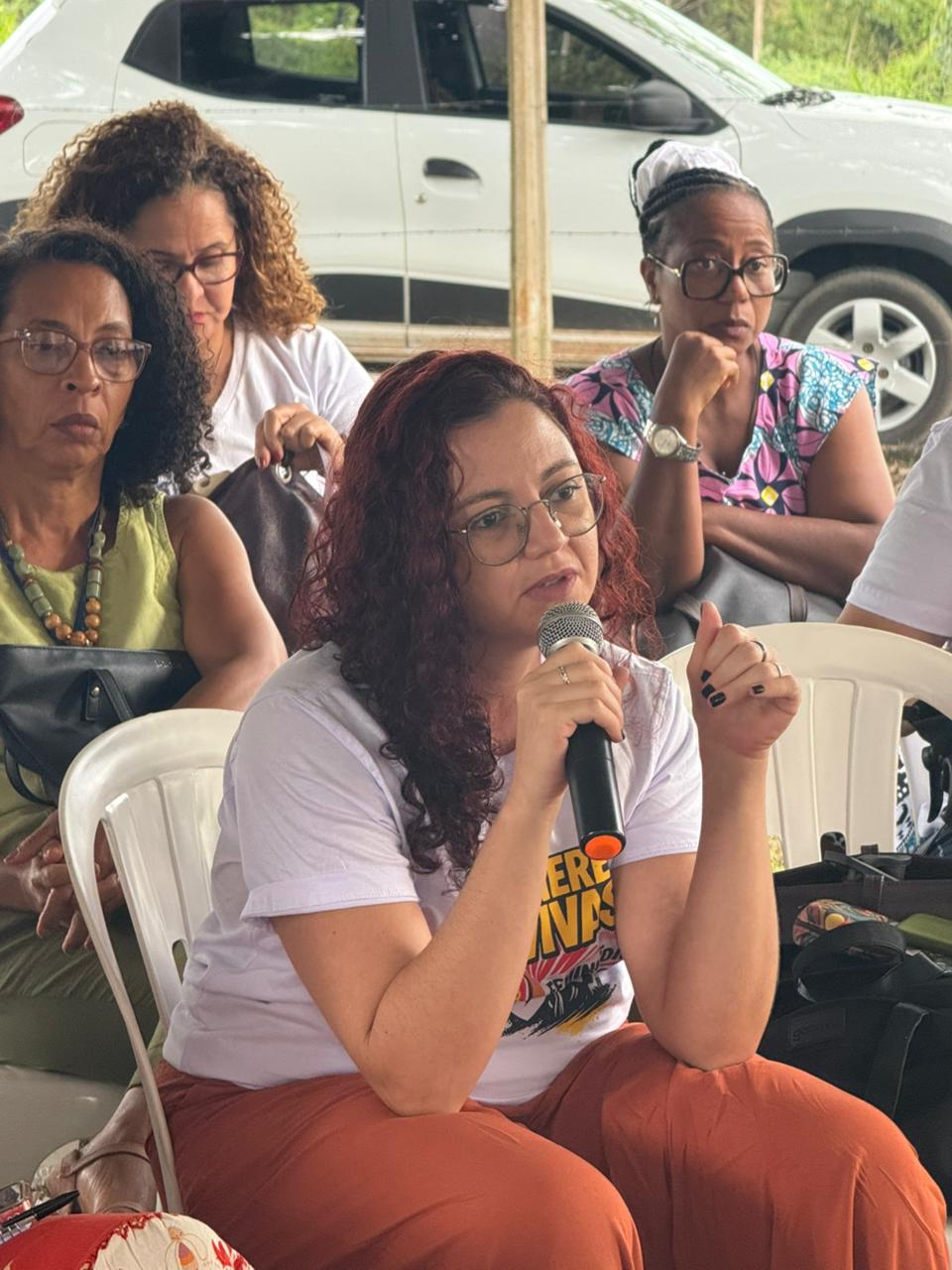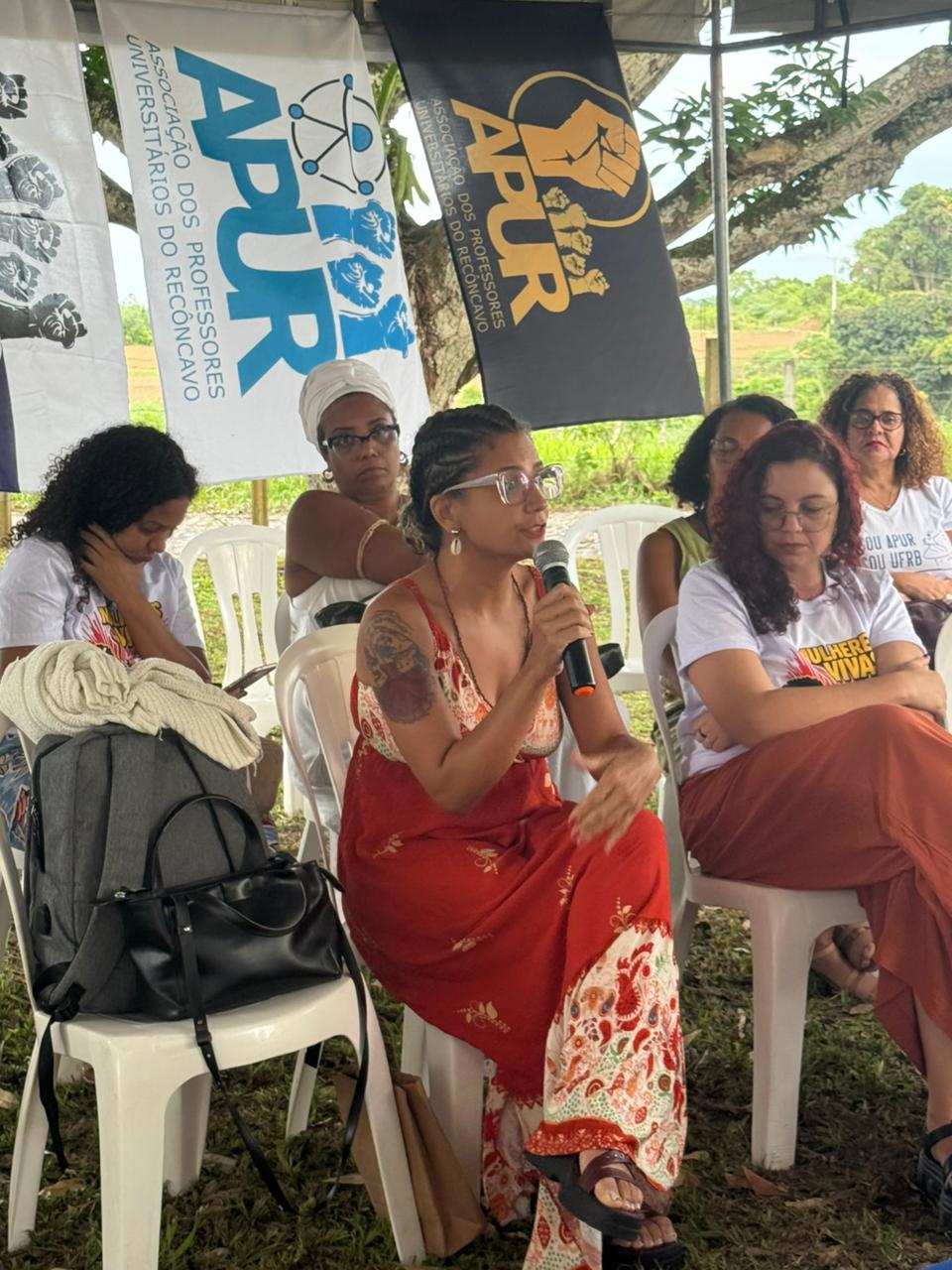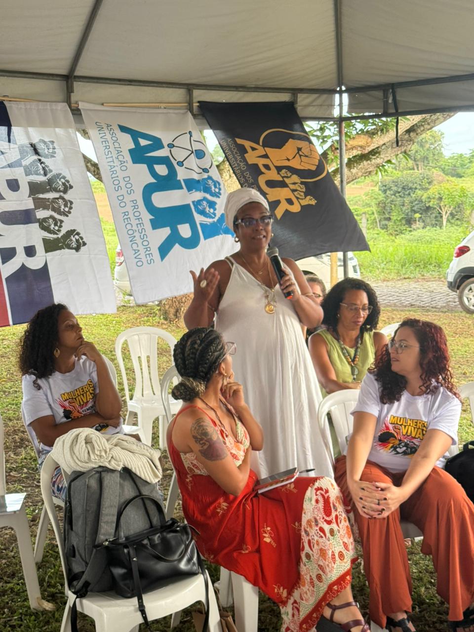 Participaram da mesa de debates as professoras Ana Cristina Givigi (UFRB); Deise Queiroz da Silva (UFRB); Katia Maria de Aguiar Barbosa (UNEB); Yérsia Souza de Assis (UFRB); da mediadora e vice-presidenta da APUR, Talita Lopes Honorato (UFRB), além de professoras/es filiadas/os.