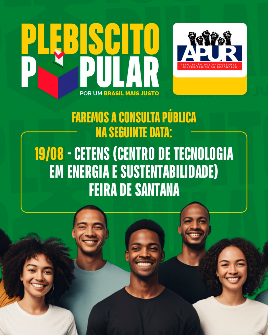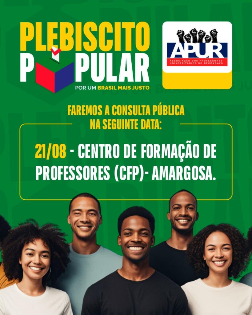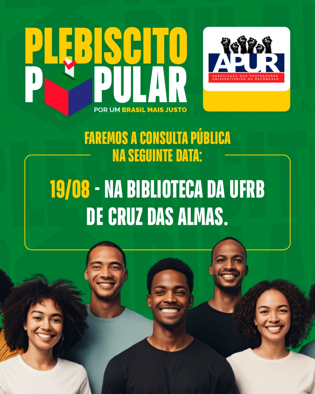 A Associação dos Professores Universitários do Recôncavo (APUR) instalará urnas para coleta de votos do Plebiscito Popular Por um Brasil Mais Justo a partir desta terça-feira, 19. O Plebiscito reivindica justiça tributária e direitos dos/das trabalhadores/as de todo o País, com a defesa da cobrança de mais impostos do grupo de super ricos, redução da escala de trabalho, redução das emendas parlamentares, isenções tributárias para a população mais pobre, dentre outras ações. Veja abaixo como participar.